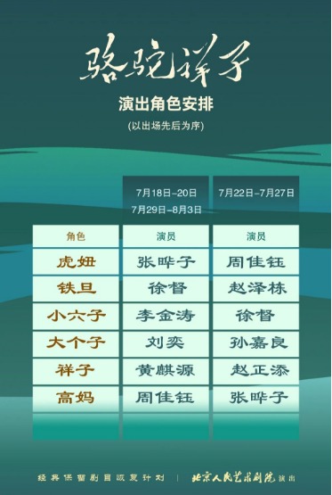 本剧多个角色将由剧院演员分别饰演,其中由刘宸、于震饰演的刘四爷本轮演出将由刘宸出演全部场次,其余角色演出场次安排详见下表: